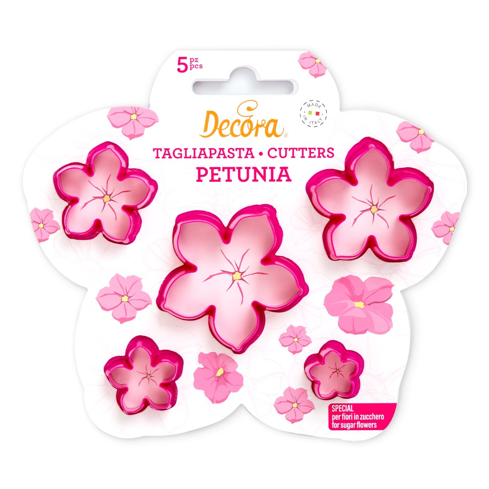 Комплектът резци Петунии, 5 бр./комплект DECORA съдържа пластмасови резци с диаметри 2 – 3 – 4 – 5 – 6 см, предназначени за създаване на цветя петунии в различни размери. Идеални за декорация на торти, мъфини и сладкарски изделия с фондант или захарно тесто.